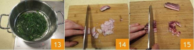 en la laissant plutôt croquante 13. Coupez l'échalote en rondelles 14 puis aussi le bacon fumé en fines lanières 15.