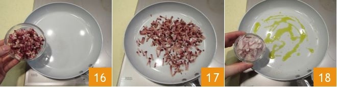 Faites revenir le bacon dans une poêle antiadhésive 16 jusqu'à ce qu'il devienne croustillant et doré 17. Faites revenir l'échalote en rondelles dans une poêle avec un filet d'huile pendant 10 minutes 18,