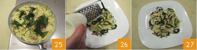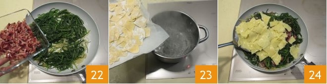 et mélangez bien pour assaisonner, en sautant quelques secondes dans la poêle 25. Servez les maltagliati avec barbe de frate et terminez avec la ricotta râpée 26, puis servez-les bien chauds 27.