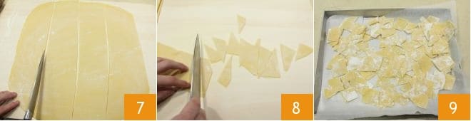 Puis découpez des bandes 7 et coupez la pâte en losanges ou en n'importe quelle forme 8. Placez les maltagliati au fur et à mesure sur un plateau légèrement fariné et farinez-les à nouveau 9. Puis étalez aussi l'autre pâton et répétez les mêmes opérations.