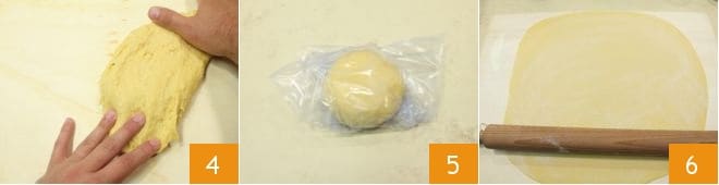 Terminez de pétrir sur un plan de travail pour obtenir une consistance lisse et homogène 4; formez une boule et enveloppez-la de film plastique 5: la pâte devra reposer au moins 30 minutes dans un endroit frais, à l'abri des courants d'air. Une fois le temps écoulé, reprenez la pâte aux œufs et divisez-la en deux pâtons; pendant que vous étalez le premier, laissez l'autre enveloppé dans le film. Étalez avec le rouleau une feuille de 1-2 mm 6.