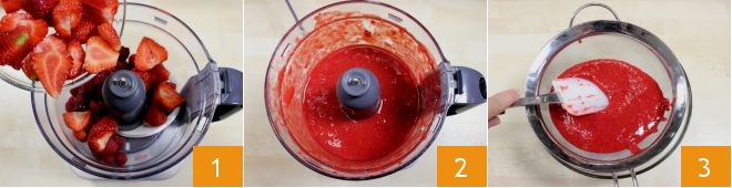 Pour préparer les meringues aux fruits rouges, commencez par nettoyer les fruits. Rincez les framboises et les fraises sous l'eau courante, puis retirez les feuilles vertes de ces dernières à l'aide d'un couteau et coupez-les en deux. Versez ensuite les framboises et les fraises dans le mixeur 1, actionnez le mixeur pour réduire les fruits en purée homogène 3. Puis filtrez-la à l'aide d'une passoire fine, en vous aidant d'une spatule ou d'une cuillère pour recueillir la pulpe tamisée dans un petit bol 3. La pulpe ainsi recueillie doit peser environ 75 g.