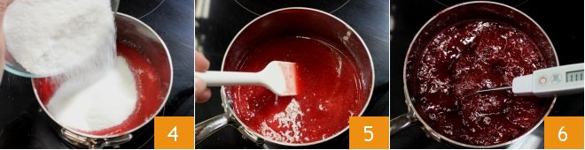 Passez-la ensuite dans une petite casserole, ajoutez 100 g de sucre 4 et allumez le feu, en remuant pour faire fondre le sucre 5. Portez la pulpe à 121°C 6 en surveillant la température avec un thermomètre alimentaire. Quand le sirop atteint 115°C, commencez à monter les blancs d'œufs.