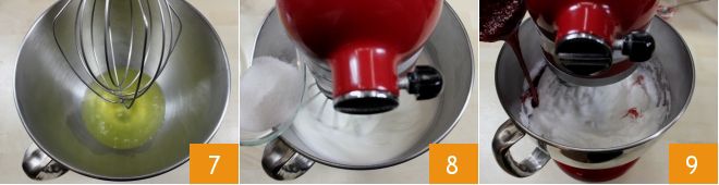 Versez les blancs d'œufs dans le bol d'un robot pâtissier 7 et actionnez les fouets (si vous n'avez pas de robot, vous pouvez utiliser un batteur électrique). Lorsqu'ils sont à moitié montés, avec les fouets encore en marche, ajoutez 25 g de sucre 8. Continuez à fouetter pour incorporer le sucre, puis lorsque le sirop atteint 121°C, ajoutez-le en filet aux blancs d'œufs montés 9 tout en laissant les fouets en marche, jusqu'à obtenir un mélange mousseux homogène et complètement froid.