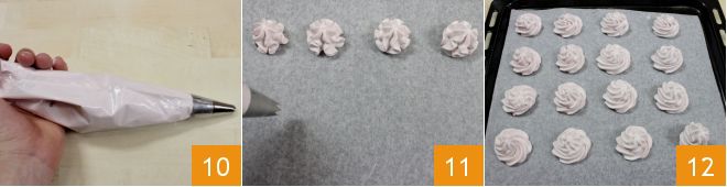 Lorsque la crème est prête, transférez-la dans une poche à douille munie d'une douille étoile 10. Tapissez une plaque à pâtisserie de papier sulfurisé et commencez à créer des petits tas de meringue en les espaçant de quelques centimètres les uns des autres 11. Une fois que vous avez terminé toute la pâte 12, faites cuire dans un four statique à 100°C pendant 3 heures, jusqu'à ce que les meringues soient fermes et légèrement colorées en dessous. Contrairement à la meringue classique française, cette meringue reste encore un peu moelleuse à l'extérieur et croustillante à l'intérieur.