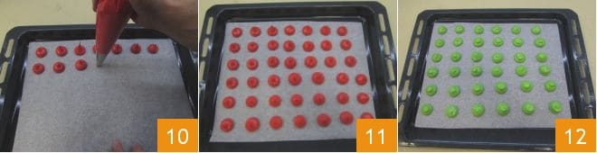 À ce stade, prenez une plaque de cuisson et tapissez-la de papier sulfurisé. Versez les mélanges colorés de meringue dans deux poches à douille munies de douille lisse ; commencez avec l'un et formez de petits boutons de pâte de meringue d'un diamètre de 2 ou 3 cm 10 en les espaçant les uns des autres. Vous devriez obtenir 30 petites meringues. Répétez l'opération avec l'autre poche à douille. Enfournez dans un four statique préchauffé à 90°C pendant au moins 3 heures, en veillant à laisser la porte du four légèrement entrouverte pour permettre à l'humidité de s'échapper autant que possible. Une fois le séchage terminé 12, sortez du four et laissez refroidir.