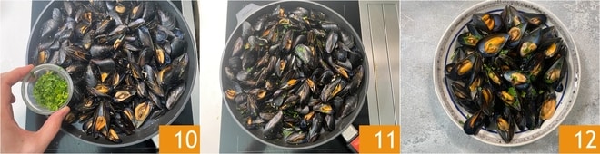 Ajoutez le persil haché 10, mélangez une dernière fois 11 et servez vos moules marinières bien chaudes 12 !
