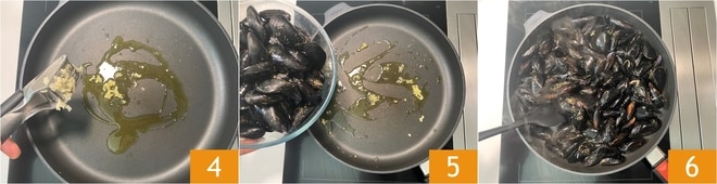 Ajoutez l'ail entier, ou écrasez-le avec l'outil approprié 4. Chauffez, laissez infuser et ajoutez les moules 5. Mélangez 6 et maintenez le feu moyen-élevé.