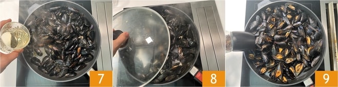 Déglacez avec le vin blanc 7 et laissez évaporer la partie alcoolique, puis couvrez avec un couvercle 8 et faites cuire pendant environ 5 minutes jusqu'à ce qu'elles soient toutes ouvertes. De temps en temps, secouez la casserole, sans retirer le couvercle, pour faciliter leur ouverture. À ce stade, ajoutez le poivre noir 9.
