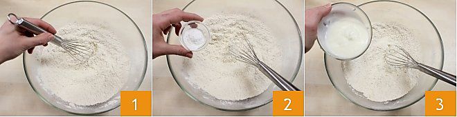 Pour préparer les muffins à l'épeautre avec fraises et amandes, dans un bol, mélangez la farine d'épeautre et le sucre de canne brut, avec l'aide d'un fouet 1. Ajoutez ensuite la levure 2 et le yaourt 3,