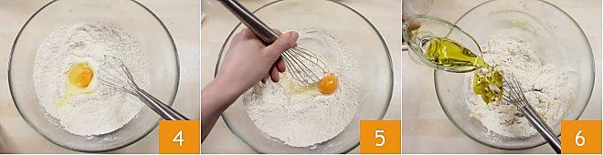 Puis cassez les œufs et ajoutez-les 4 puis mélangez avec le fouet 5. Enfin, versez l'huile d'olive extra vierge en filet 6 et mélangez bien les ingrédients.
