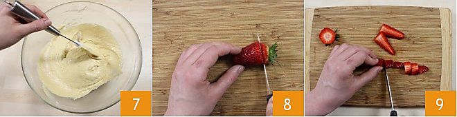 Continuez à mélanger avec une spatule jusqu'à obtenir un mélange homogène et moelleux 7. Lavez les fraises, équeutez-les et coupez-les en morceaux (8-9).
