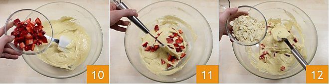 Ajoutez les fraises à la pâte des muffins 10, mélangez 11 et enfin ajoutez les amandes effilées 12. N'oubliez pas de réserver une poignée de fraises et d'amandes qui vous serviront pour la décoration finale.