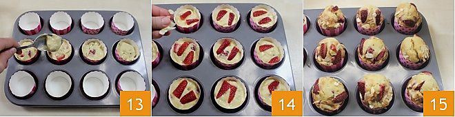 Dans un moule à muffins, placez les caissettes en papier et remplissez-les aux 3/4 de leur hauteur avec la pâte 13; ajoutez quelques morceaux de fraises et des lamelles d'amandes sur la surface de chaque muffin 14 et faites cuire les muffins à l'épeautre dans un four déjà préchauffé à 180° pendant 20-25 minutes (si four à chaleur tournante 160° pendant 15-20 minutes). Sortez les muffins à l'épeautre avec fraises et amandes 15, laissez-les refroidir sur une grille et servez-les!