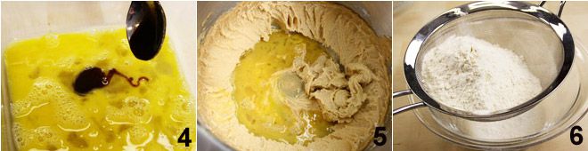 À part, battez l'œuf avec l'extrait de vanille et une demi-cuillère à café de sel 4 et incorporez-les au mélange de beurre de cacahuètes 5. Tamisez la farine avec la levure 6.