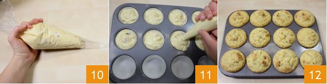 Transférez le mélange dans une poche à douille 10, préparez un moule à muffins avec les caissettes et remplissez-les jusqu'au bord 11. Faites-les cuire dans un four préchauffé à 180° pendant 25 minutes 12 : voilà, les muffins de panettone sont prêts !