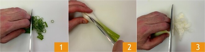 Pour réaliser le nasi goreng, commencez par préparer tous les ingrédients : coupez finement la partie verte de l'oignon nouveau 1, puis divisez la partie blanche en deux dans la longueur 2 et coupez-la en julienne 3.