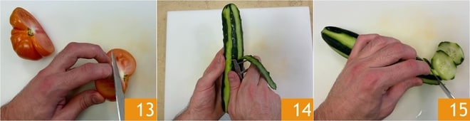 Préparez également les ingrédients pour la décoration : coupez la tomate en quartiers 13, puis épluchez le concombre en bandes alternées 14 et coupez-le en fines rondelles 15.