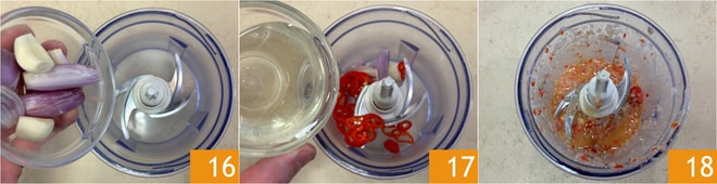 Enfin, préparez la sauce pour le soffritto : épluchez les gousses d'ail et d'échalote et mettez-les dans un mixeur 16 avec la moitié du piment et l'huile de graines 17, puis mixez le tout 18.