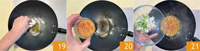 Passez à la cuisson : huilez un wok avec l'huile de graines en vous aidant de papier absorbant 19, allumez le feu et versez la sauce à l'ail et au piment 20. Faites revenir une minute à feu vif, puis ajoutez la partie blanche de l'oignon nouveau 21.