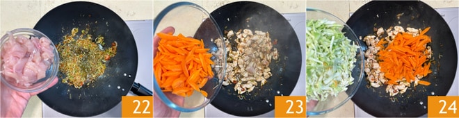 Après une minute, ajoutez le poulet 22 et faites-le dorer brièvement. Lorsqu'il commence à changer de couleur, ajoutez les carottes 23 et le chou 24 et faites sauter le tout.
