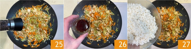 Une fois que les légumes sont flétris, rectifiez l'assaisonnement avec du sel et du poivre 25, puis déglacez avec la sauce soja 26 et mélangez bien pour parfumer. À ce stade, ajoutez le riz 27.