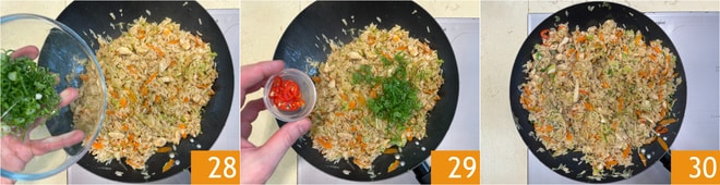 Faites sauter le tout à feu vif pendant quelques minutes, puis ajoutez la partie verte de l'oignon nouveau 28 et le reste du piment 29. Mélangez encore et éteignez le feu 30.