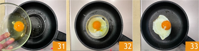 Huilez une autre poêle avec de l'huile de graines, placez un emporte-pièce à l'intérieur et versez un œuf au centre 31. Faites cuire à feu doux pendant quelques minutes 32 en ajoutant une pincée de sel, jusqu'à ce que le blanc soit cuit et le jaune encore tendre 33. Procédez de la même manière pour cuire les autres œufs (alternativement, vous pouvez les cuire en même temps en utilisant une poêle plus grande).