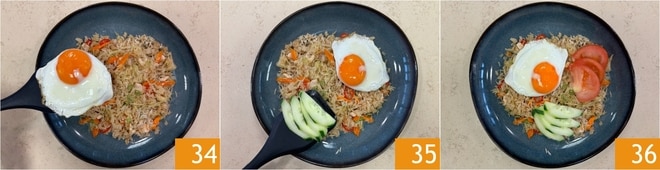 Servez le nasi goreng en plaçant l'œuf au plat sur le dessus 34 et en garnissant avec les concombres 35 et les tomates crues. Le nasi goreng est prêt à être servi 36 !