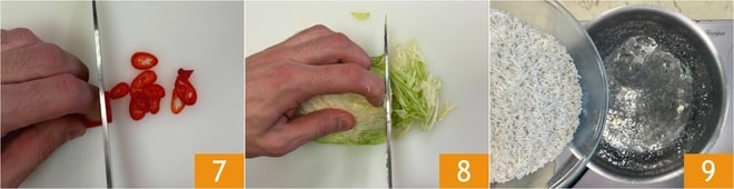 Coupez le piment en rondelles 7 et le chou en julienne 8. Portez à ébullition une casserole d'eau salée et faites cuire le riz basmati pendant 8 minutes 9.