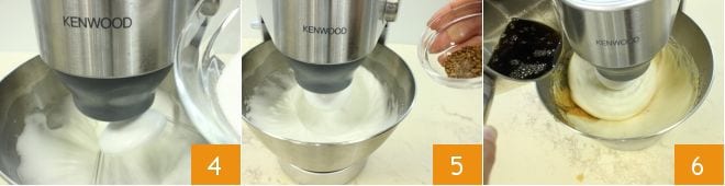 ajoutez 50 g de sucre semoule 4 et dès qu'ils deviennent blancs, ajoutez le café soluble en granulés 5. Les blancs doivent déjà être bien montés quand le sirop atteint 121°C. Lorsque le sirop a atteint la température indiquée, versez-le en filet dans les blancs 6, en continuant de battre avec les fouets jusqu'à complet refroidissement de la meringue.