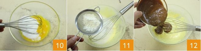 Entre-temps, occupez-vous de la crème : mettez les jaunes d'œufs et le sucre dans un bol et fouettez avec un fouet à main 10 jusqu'à obtenir un mélange clair et mousseux. Tamisez directement dans le bol la farine et l'amidon 11, ajoutez la pâte de noisettes 12 et mélangez toujours avec le fouet pour incorporer les ingrédients,