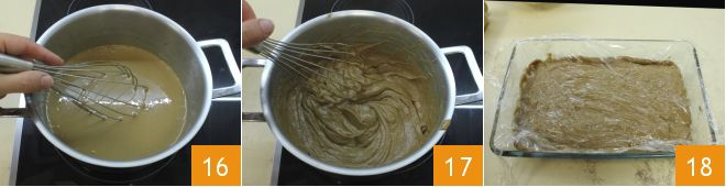 et portez à ébullition à feu moyen 16, poursuivez la cuisson jusqu'à obtenir une crème dense et compacte 17 en continuant de remuer avec le fouet. Transférez la crème obtenue dans un plat, couvrez avec du film plastique en contact avec la surface du mélange 18, laissez tiédir puis mettez la crème au réfrigérateur pour qu'elle raffermisse au moins une heure.