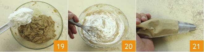 Une fois le temps de refroidissement écoulé, incorporez à la crème 200 ml de crème fouettée 19 en mélangeant avec un fouet 20, pour plus de détails consultez la fiche Comment monter la crème. Transférez la crème dans une poche à douille munie d'une douille étoilée 21 et conservez-la au réfrigérateur jusqu'au moment de l'utiliser.