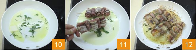 avec les feuilles de sauge et les branches de romarin 10. Ajoutez les brochettes 11 et faites-les dorer à feu doux des deux côtés ; lorsqu'elles seront bien dorées, ajoutez le poivre moulu et vaporisez-les de vin blanc. Faites cuire les oisillons envolés pendant environ 20 minutes au total, en ajoutant, si nécessaire, un peu d'eau chaude ou de bouillon bouillant. Vers la fin de la cuisson 12, rectifiez l'assaisonnement en sel et servez immédiatement en accompagnant les oisillons envolés d'une polenta traditionnelle fumante ou d'une purée de pommes de terre.