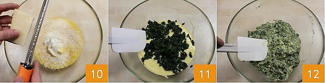 puis ajoutez le parmesan râpé, l'emmental râpé 10 et battez à nouveau. À ce stade, ajoutez les épinards au mélange d'œufs et de fromages 11, mélangez bien le tout 12.