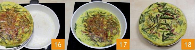 Avec le même couvercle, aidez-vous à retourner l'omelette pour la cuire de l'autre côté, en faisant glisser délicatement la partie crue qui adhère au couvercle dans la poêle 16 et continuez la cuisson sur le côté encore cru pendant quelques minutes. Une fois cuite 17, faites glisser l'omelette aux asperges sauvages et au speck sur un plat de service et servez-la 18 !