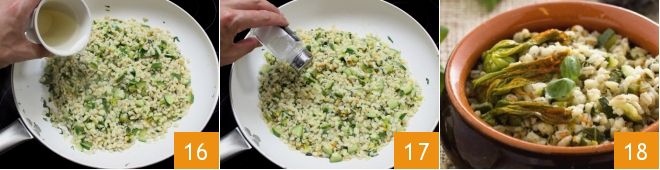 À ce stade, déglacez avec le vin blanc 16 et laissez évaporer, en remuant de temps en temps. Lorsque le vin est évaporé, éteignez le feu et ajustez le sel 17 et le poivre. Servez votre orzotto avec courgettes et fleurs de courgette, garni de quelques feuilles de basilic frais 18 !