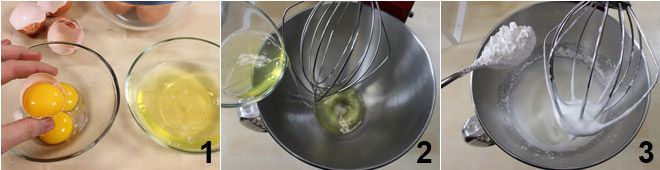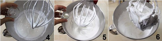 et la vanilline 4; enfin, ajoutez quelques gouttes de jus de citron 5. Mélangez délicatement pour incorporer tous les ingrédients ; une fois prêt, le mélange de meringue sera compact comme sur la photo 6.