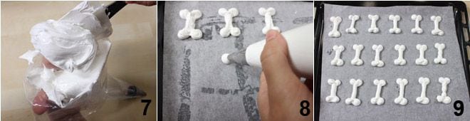 Versez maintenant le mélange dans une poche à douille munie d'une douille moyenne et lisse 7, puis tapissez une plaque de papier sulfurisé et commencez à former les os, en les façonnant avec la poche à douille 8. Enfournez le tout à 90°C pendant environ 2 heures 9, puis éteignez le four et laissez refroidir les meringues à l'intérieur pendant deux autres heures, en gardant la porte entrouverte. Lorsque les meringues seront sèches et froides, retirez-les du four et... Joyeux Halloween !