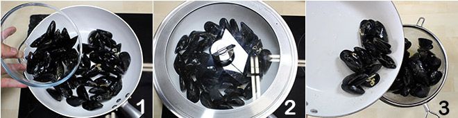 Pour préparer la paella alguéroise, lavez et nettoyez soigneusement les moules (vous pouvez suivre la procédure indiquée dans la fiche de cuisine « Comment nettoyer et ouvrir les moules »), puis placez-les dans une casserole 1, couvrez-les avec un couvercle et laissez-les s'ouvrir à feu vif pendant quelques minutes 2. Une fois que toutes les moules sont ouvertes, filtrez le fond de cuisson et mettez le tout de côté 3.