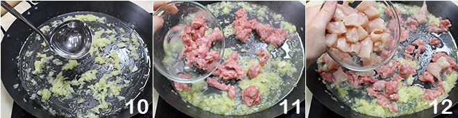 Faites revenir l'oignon à feu doux, en ajoutant une louche de bouillon de poulet pour éviter qu'il ne brûle 10, puis ajoutez la saucisse 11 et le poulet 12.
