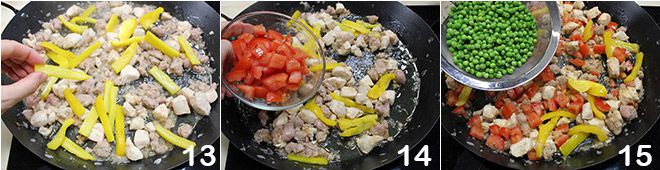 Laissez dorer les viandes pendant quelques minutes, puis ajoutez le poivron 13, les tomates 14 et enfin les pois écossés et égouttés 15.