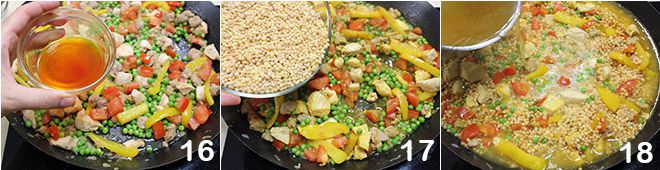 Ajoutez un peu de bouillon (environ une louche) et le safran, que vous aurez dissous dans une petite quantité de bouillon 16, puis laissez cuire le tout pendant quelques minutes. Ajoutez la fregola, en mélangeant 17, et le restant du bouillon 18 (nous conseillons d'en laisser tout de même quelques louches de côté à ajouter au cas où la paella deviendrait trop sèche) ;