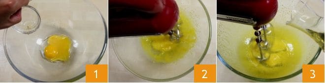 Pour préparer la paillard avec des pommes de terre et de la mayonnaise au cumin, commencez par la mayonnaise (vous pouvez également consulter la recette dans la fiche de la Mayonnaise). Dans un bol, réunissez les jaunes d'œufs à température ambiante bien séparés des blancs, ajoutez une partie du jus de citron (vous pouvez verser toute la dose maintenant ou la diviser pour éclaircir la sauce à la fin de la préparation) et ajoutez le vinaigre de vin blanc 1. Ensuite, commencez à monter avec le batteur électrique 2, ajoutez l'huile de graines en filet très fin 3.