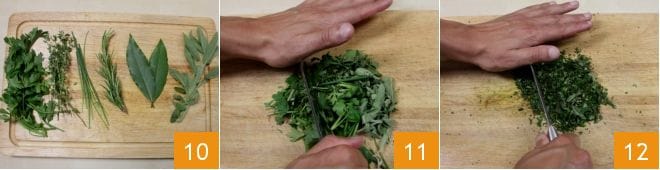 Passons maintenant à la préparation des épices qui serviront à assaisonner les pommes de terre. Prenez la sauge, le persil, le thym, le romarin, le laurier et la ciboulette 10 et hachez-les très finement avec le couteau ou une mezzalune (11-12).