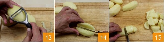 Puis, lavez les pommes de terre sous l'eau courante, ensuite épluchez-les avec un éplucheur 13 ou la lame d'un petit couteau et coupez-les en deux 14. Placez chaque moitié sur la planche à découper côté coupé vers le bas et découpez des demi-lunes d'environ 1 cm d'épaisseur 15.