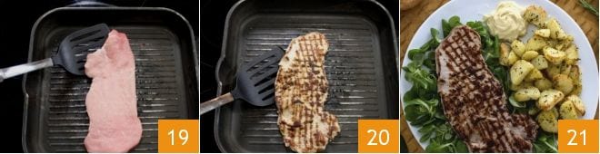 Passez ensuite à la préparation de la paillard. Chauffez une grille en fonte à feu vif. Prenez la paillard, battez-la légèrement avec l'attendrisseur si nécessaire pour rendre la tranche épaisse de seulement quelques millimètres et déposez-la sur la plaque pour la saisir quelques secondes 19. Ensuite, retournez-la à l'aide d'une spatule car avec les dents d'une fourchette, vous risqueriez de faire sortir les jus internes de la viande et le résultat serait plus sec. Faites cuire quelques secondes de l'autre côté également 20. Maintenant que tous les ingrédients sont prêts, vous pouvez composer votre plat principal : par exemple, vous pouvez disposer sur un plat de service un lit de mâche et déposer la paillard avec à côté les pommes de terre et la mayonnaise que vous aurez sortis du réfrigérateur 21. Servez votre paillard avec des pommes de terre et de la mayonnaise au cumin chaud !