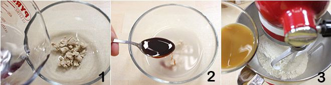 Pour préparer le pain farci au lard et aux figues, commencez par la réalisation de la pâte à pain (pour plus de détails sur la réalisation de la pâte à pain cliquez ici): dissolvez la levure de bière dans un peu d'eau tiède (prise de la quantité totale d'eau prévue pour la recette) 1 avec une cuillère à café de malt (ou de sucre, si vous n'avez pas cet ingrédient particulier) 2. Dans un autre récipient, tamisez ensemble la farine 00 et la farine manitoba et placez-les dans le batteur, puis ajoutez le mélange de levure et de malt et mettez l'appareil en marche pour mélanger tous les ingrédients 3.