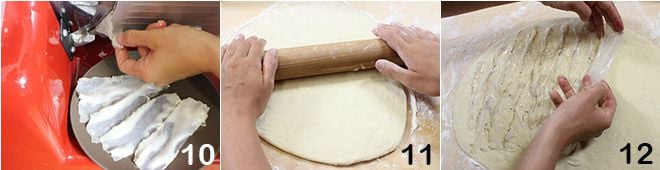 puis découpez 30 tranches d'un morceau entier de lard, en utilisant la trancheuse (si vous ne l'avez pas, nous vous conseillons d'acheter le lard déjà tranché) 10. Saupoudrez à nouveau le plan de travail de farine et étalez, à l'aide d'un rouleau à pâtisserie, la pâte à pain en forme d'ovale d'environ 1-2 cm d'épaisseur 11. Disposez sur la pâte les tranches de lard, jusqu'à couvrir complètement la surface 12,
